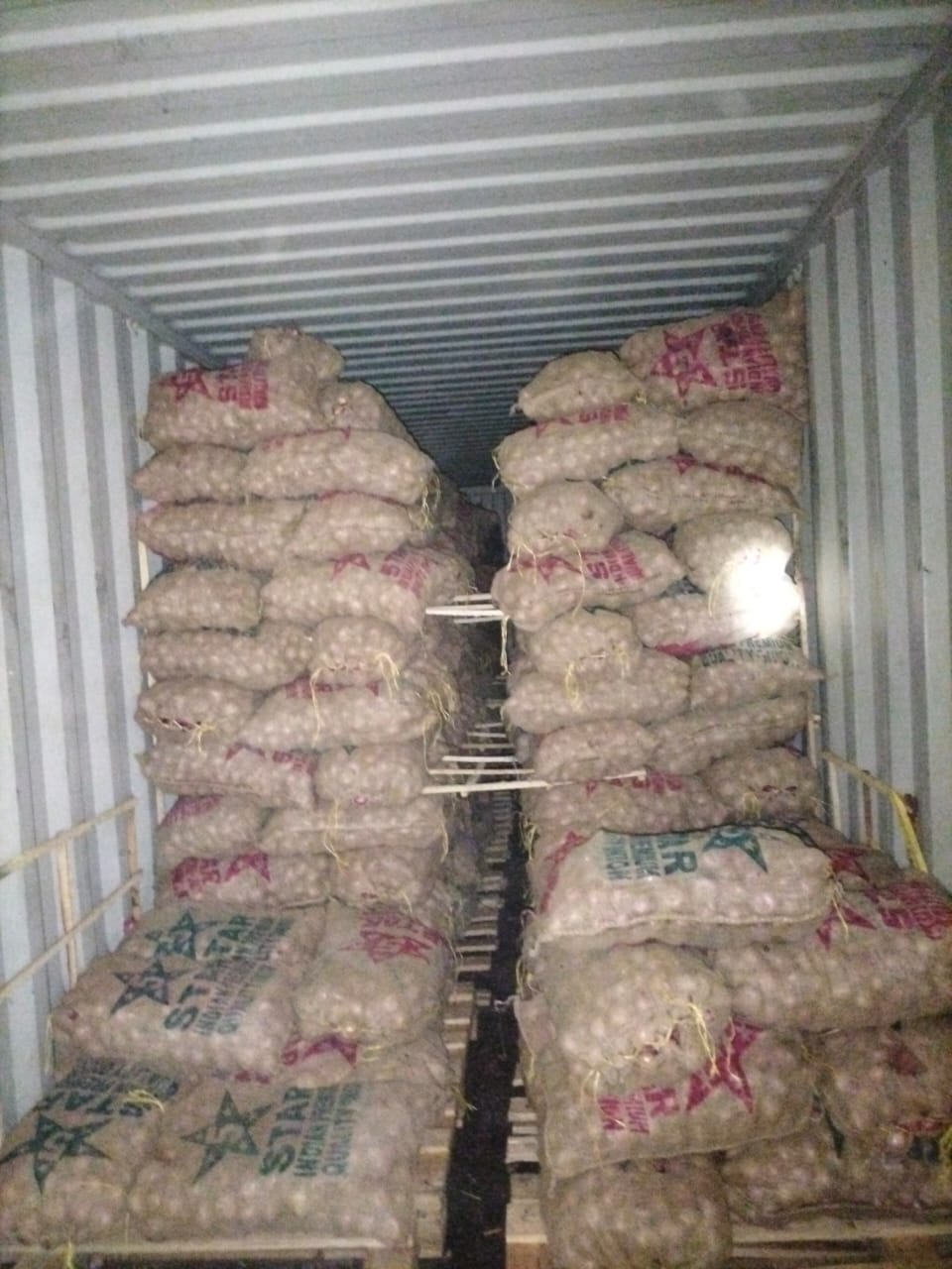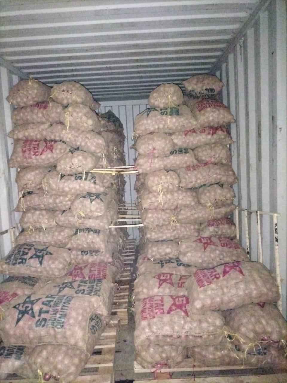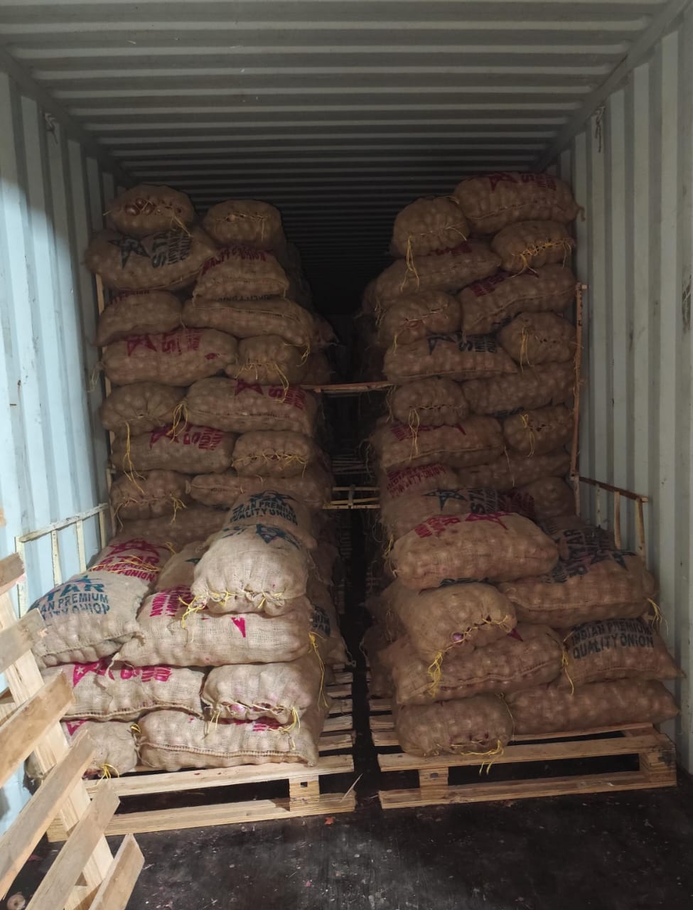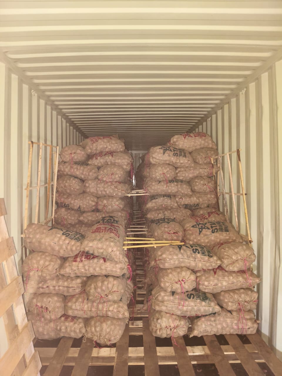 Systematic loading of premium quality onions in mesh bags, properly stacked on wooden pallets for international shipping